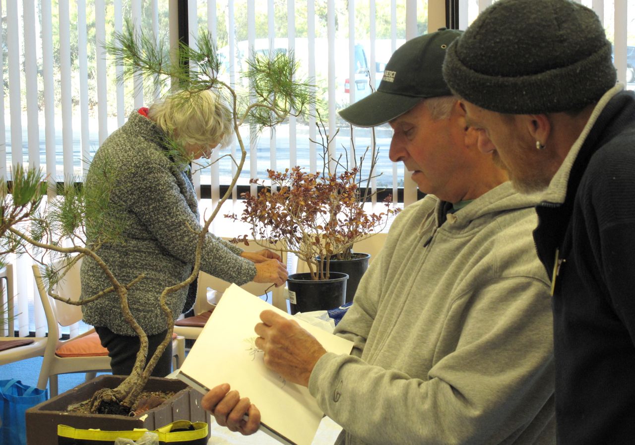 Peter Adams sketching a design for Kenn’s Black pine – Shirley busy wiring in the background